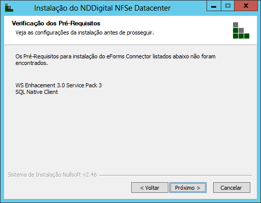 O instalador do NDDigital NFS-e Datacenter faz a verificação de todos os componentes que são pré-requisitos para o seu funcionamento e, caso detecte ausência de algum, é apresentado o componente que está faltando, onde o usuário deve realizar a instalação do componente faltante. Será exibida a tela inicial, clique em Próximo, como mostra a imagem abaixo: