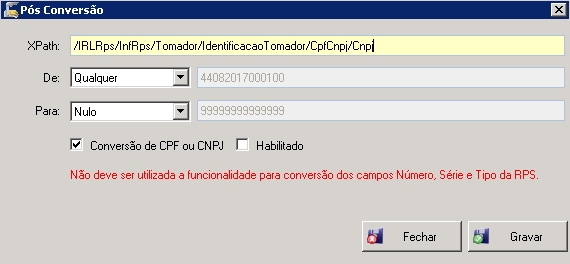 Observação: Para os campos Número, Série e Tipo não poderão realizar a pós conversão. |