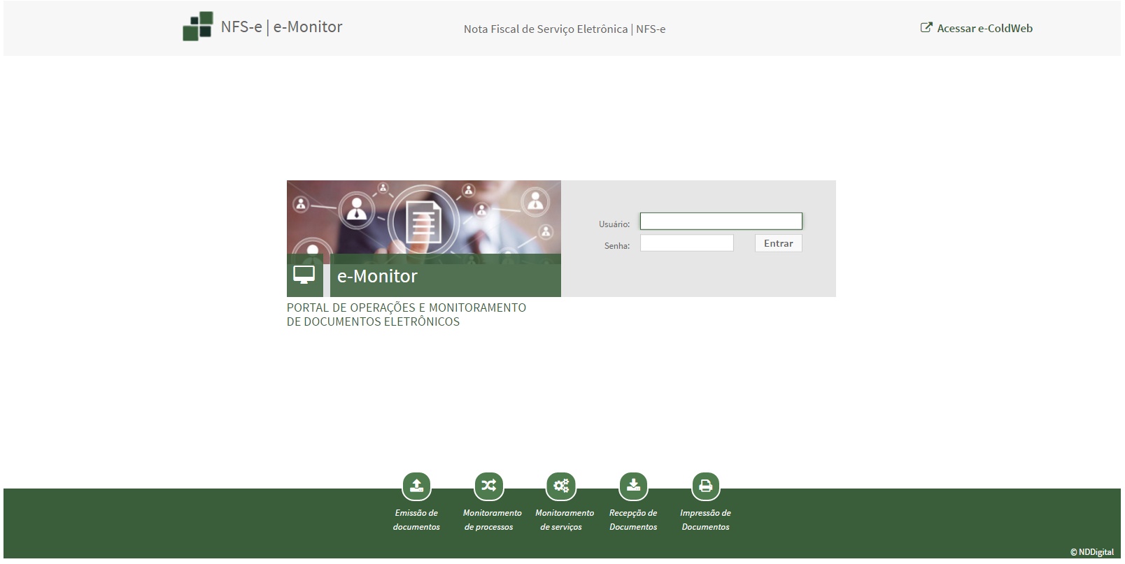 Para acessar o NFS-e e-Monitor, clique no ícone NFS-e e-Monitor, criado na área de trabalho, ou acesse o menu Iniciar\Programas\NDDigital\NFS-eCold\NFS-eMonitor. Ao iniciar o NFS-e e-Monitor é necessário efetuar Login. Digite o Usuário e a Senha e clique em Entrar.