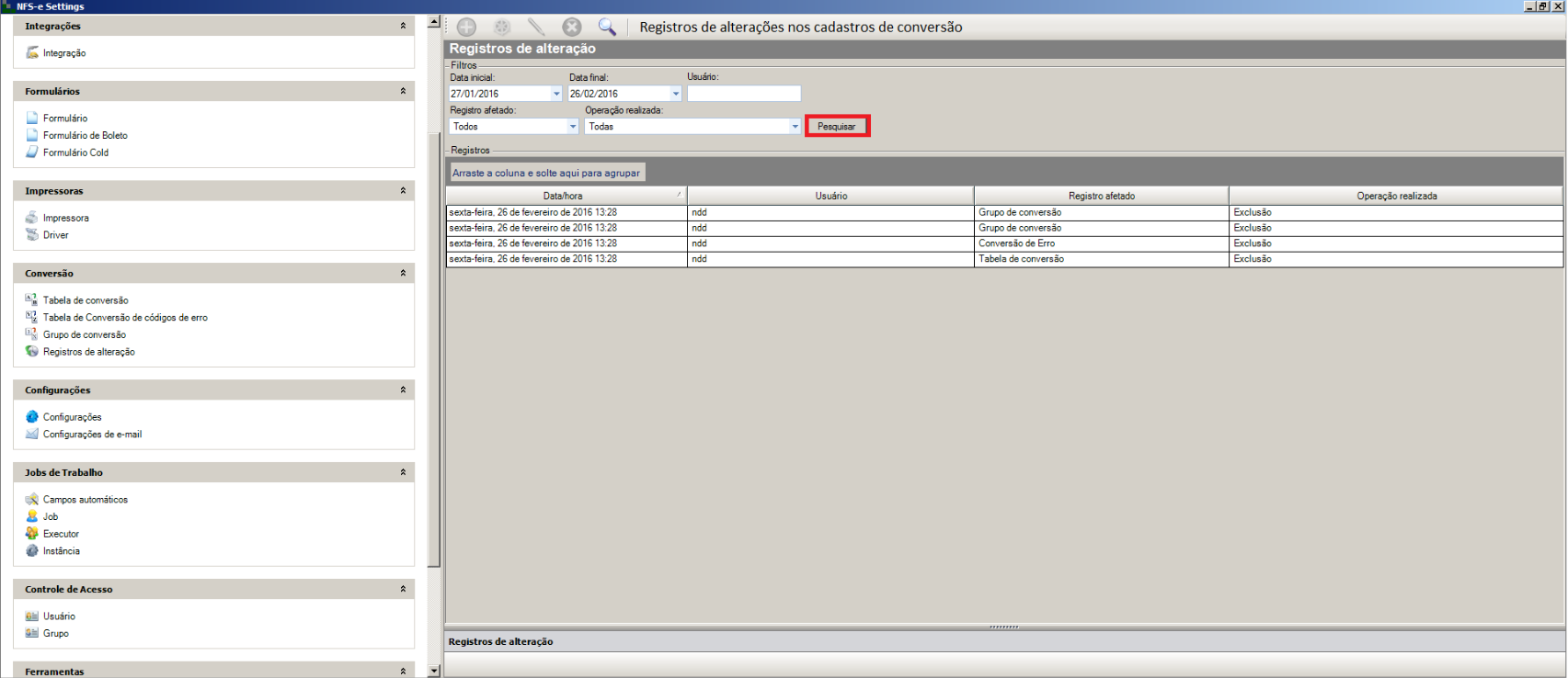 E.Ligação do grupo de Conversão alterado no Job: Quando é feita a alteração de uma tabela de conversão ou grupo de conversão no Job, ou quando é criado um grupo de conversão pelo Job. Pode-se ainda, filtrar as informações utilizando os campos Data inicial, Data final, Usuário, Registro afetado e Operação realizada.