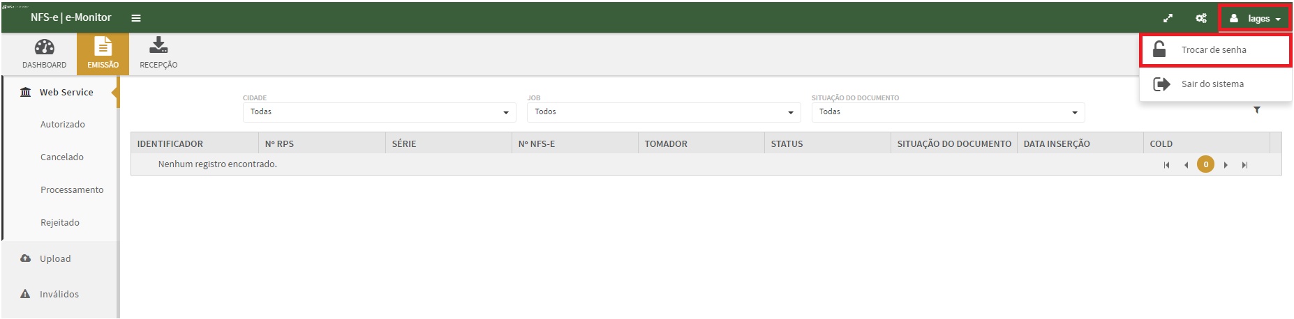 Trocar de senha através do portal NFS-e e-Monitor após realizar login |