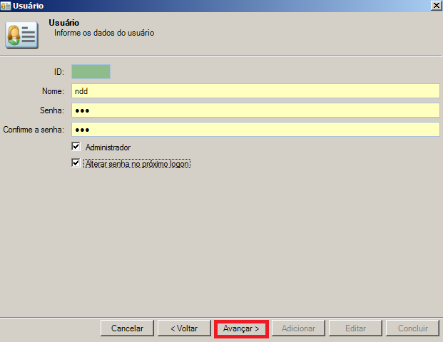 E.Marque a opção Alterar senha no próximo logon, permitir que o Usuário personalize sua senha no primeiro acesso ao portal. Após informar todos os dados, clique no botão Avançar.