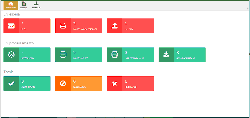 Quando logado no portal do NFS-e e-Monitor, será apresentada a aba de Dashboard onde será possível visualizar as informações de processos do sistema e totais de notas conforme status para os documentos emitidos via Web Service do mesmo dia. Não serão contabilizados documentos Rejeitados (Documentos Inválidos), e Recepção (NFS-e Entrada) e emitidos via Upload.