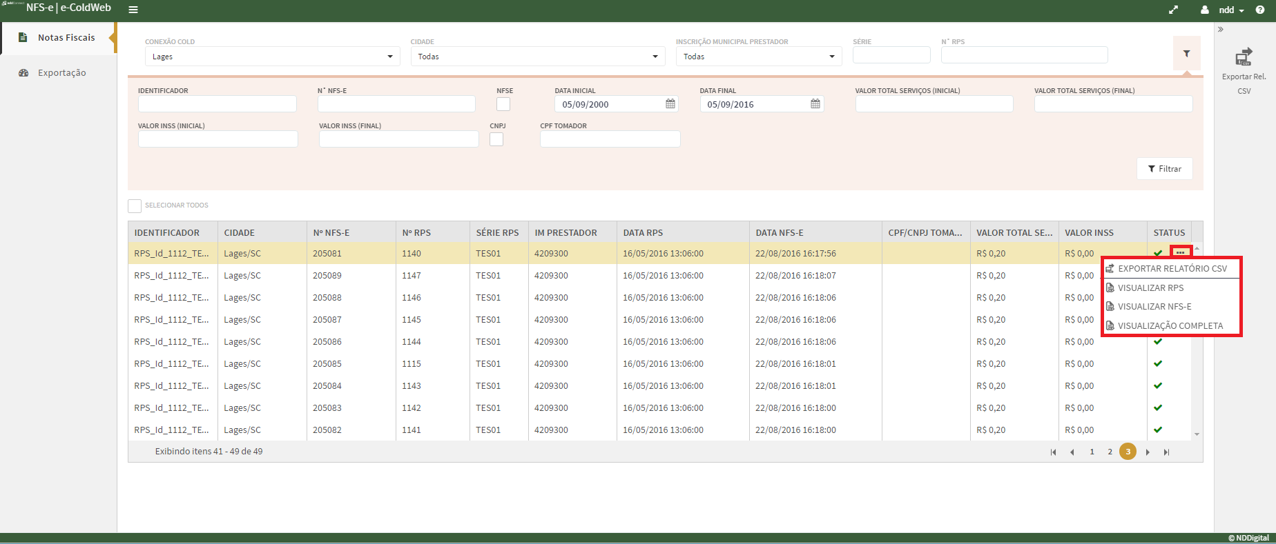 Para visualizar os documentos de Visualizar RPS, Visualizar NFS-e e Visualização Completa, selecione um registro no grid e clique sobre reticências(...), localizado no final da linha na coluna status, em seguida clique na visualização desejada.
