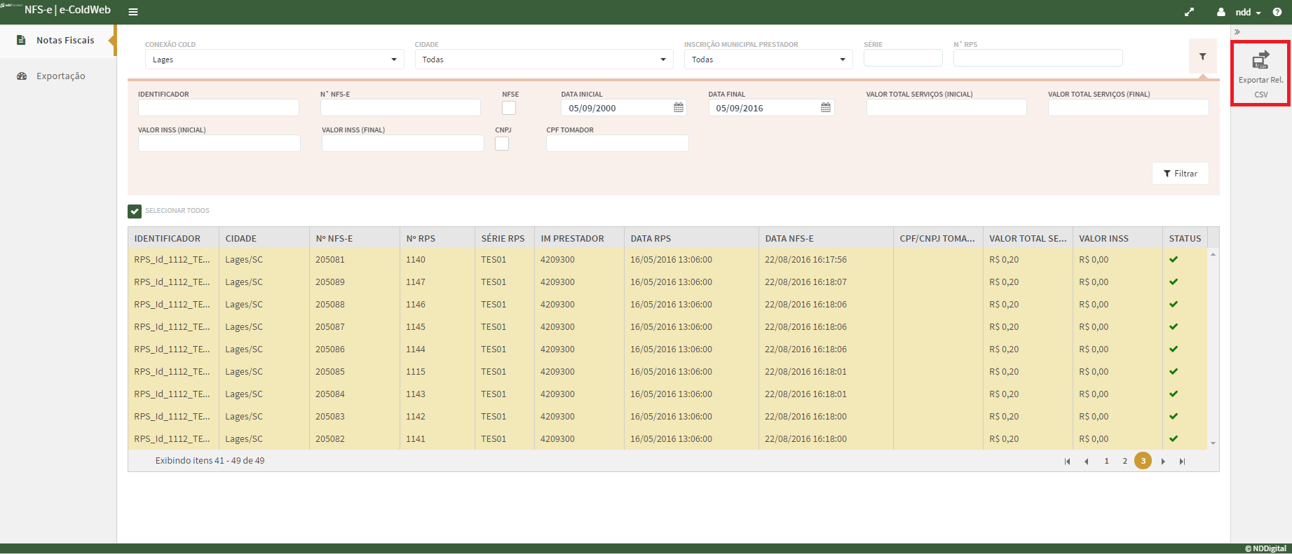 Para realizar as exportações dos documentos, Relatório CSV, onde será exportado com a extensão ".csv" na exportação em lote. Utilize o menu a esquerda do portal do NFS-e e-ColdWeb para exportações, onde: