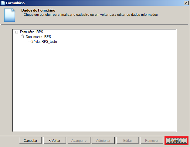 Passo 12: Confira o formulário e o documento cadastrado na tela Dados do Formulário, e clique no botão Concluir.
