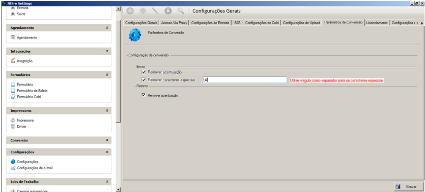 B.Campo Remover caracteres especiais: Utilizado para remover os caracteres especiais nos arquivos de RPS enviados para prefeitura.