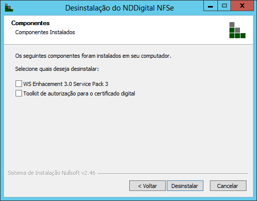 Para desinstalar a solução, basta ir em: menu Iniciar\Programas\NDDigital\NFSe\Uninstall. Para prosseguir siga os passos abaixo: