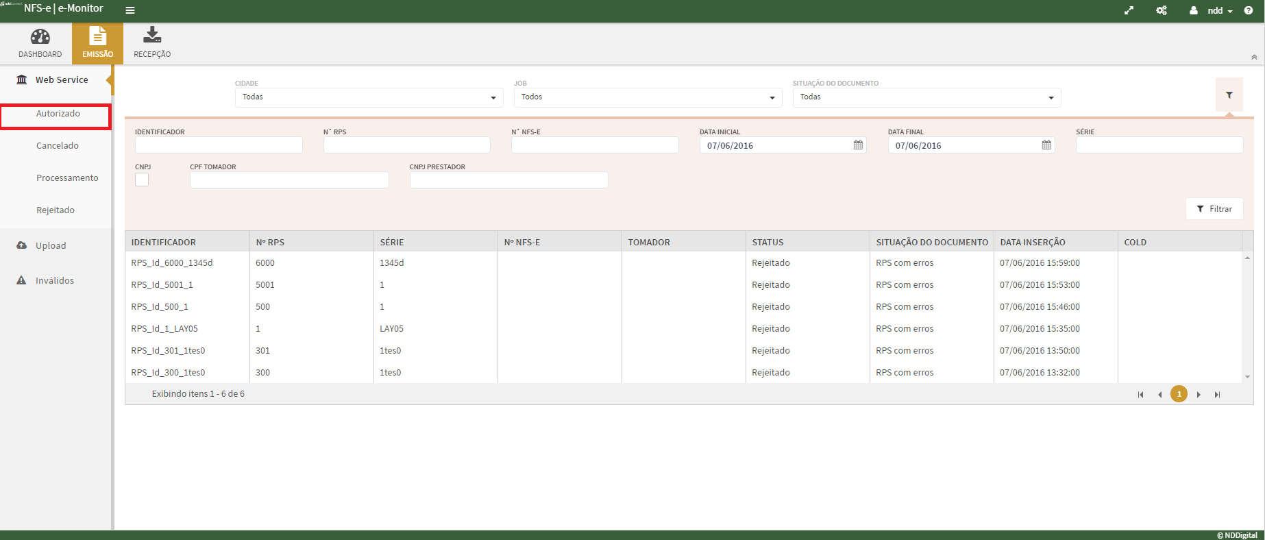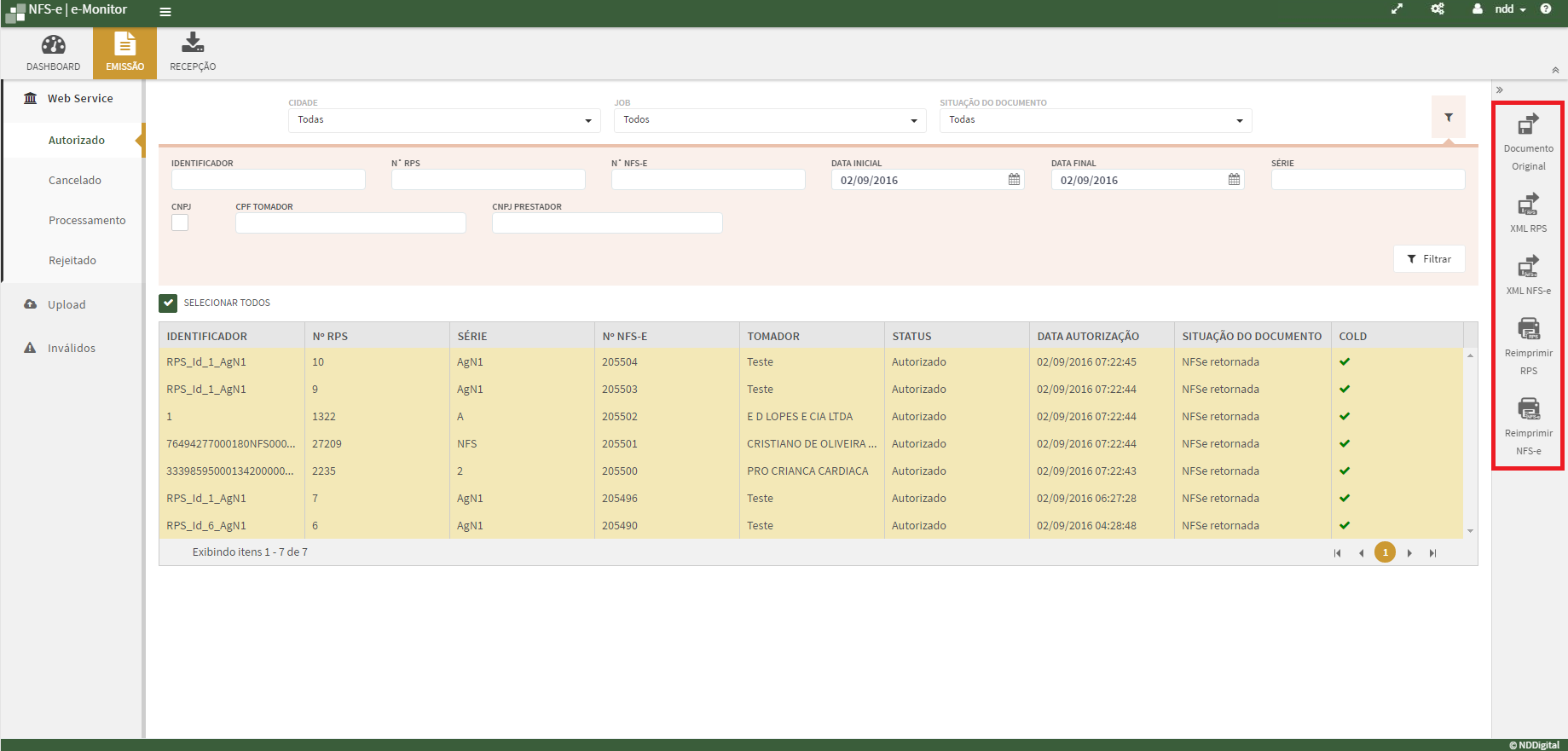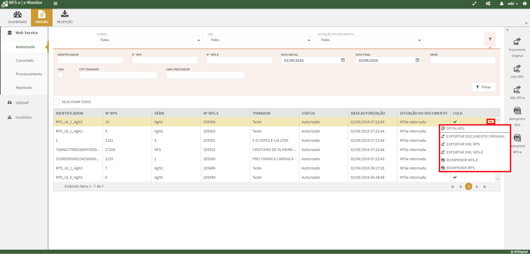 Na aba Autorizado é possível visualizar informações de documentos processados via web service que foram autorizados pela prefeitura. É possível também realizar a exportação do Documento Original, XML de RPS, XML NFS-e, Reimprimir RPS, Reimprimir NFS-e e visualizar os detalhes do documento. A coluna Cold apresenta os documentos que foram inseridos no Cold.