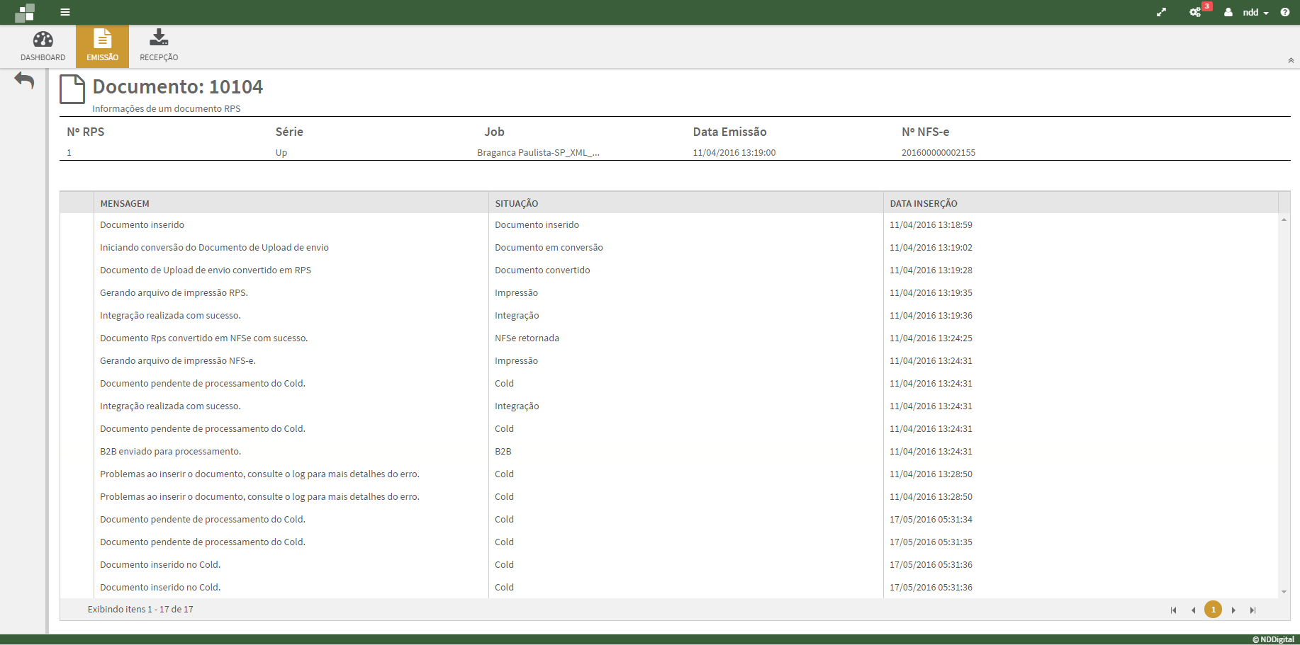 Na tela Detalhes é informado os dados do documento detalhadamente, entre seus dados os passos do processamento do documento até o status final do documento.