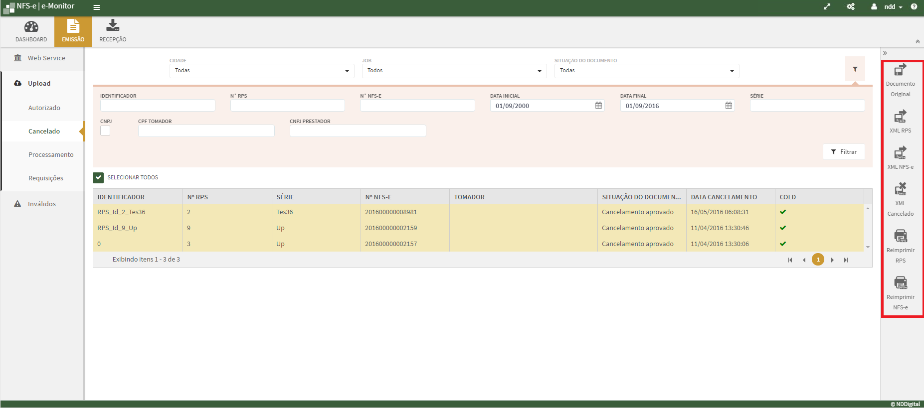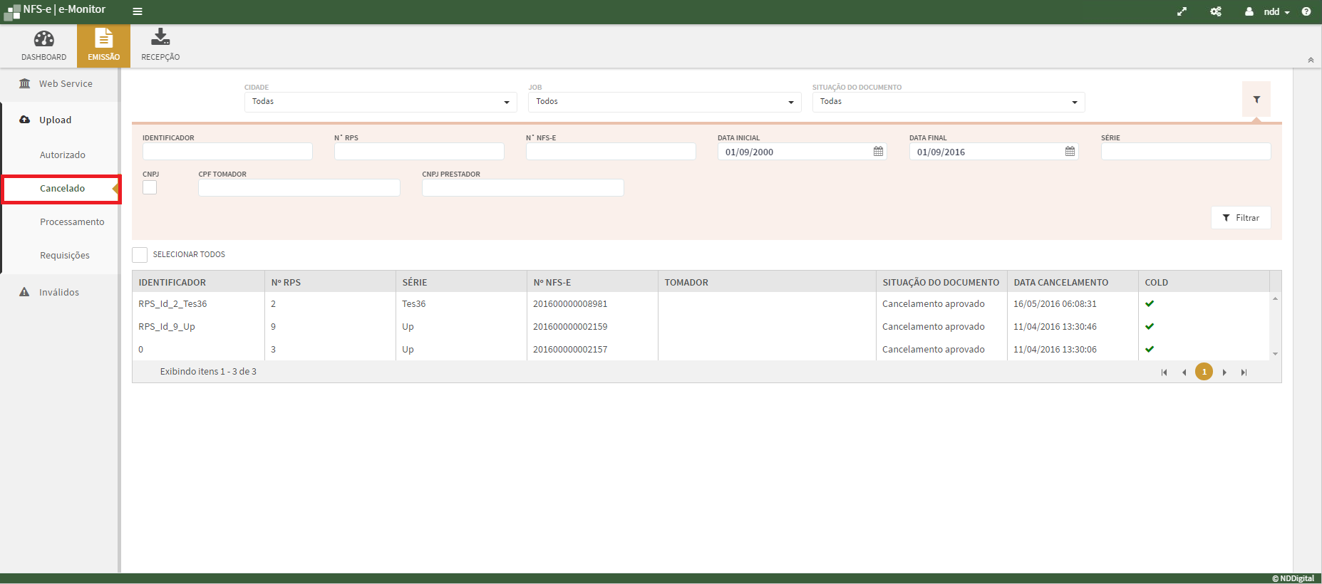 Na aba Cancelado é possível visualizar os documentos, os Detalhes dos documentos processados via Upload que foram cancelados pela prefeitura. É possível também realizar a exportação do Documento Original, XML de RPS, XML NFS-e e XML de Cancelamento.