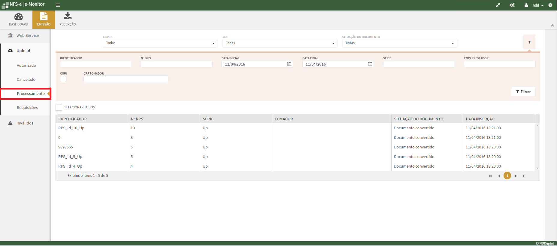 Na aba Processamento são exibidos todos os processos que estão sendo executados ou pendentes. É possível também realizar a exportação do Documento Original.