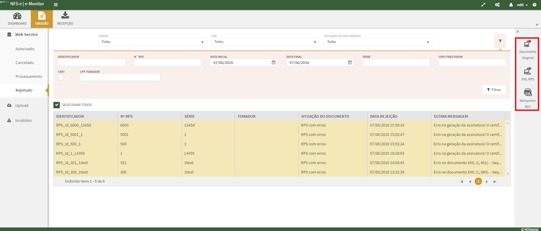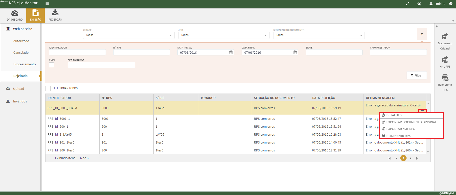 Na aba Rejeitados são exibidos todos os documentos que estão rejeitados. É possível também realizar a exportação do Documento Original, XML de RPS e Reimprimir RPS.