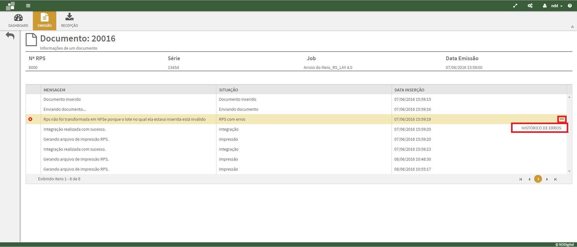 Na tela de Histórico de erros é informado o erro de negócio que foi gerado.
