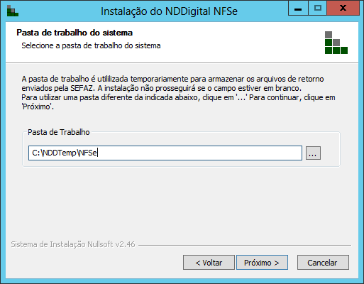Passo 7: A instalação irá criar o local da pasta de trabalho no caminho padrão e armazenar os arquivos da página em C:\NDDTemp, se desejar escolher outra unidade para a pasta de trabalho basta alterar o caminho exibido ou clicar em BotaoOpcaoselecionar(Tres Pontos). Após selecionar o local onde será criada a pasta de trabalho, clique no botão Próximo.