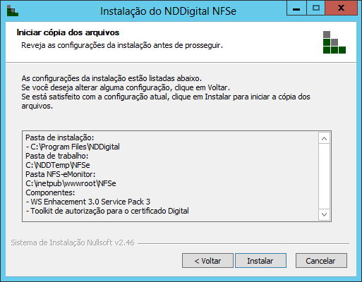 Passo 8: Confira todos os parâmetros configurados e se tudo estiver correto clique no botão Instalar para iniciar a instalação do produto, como mostra a figura abaixo: