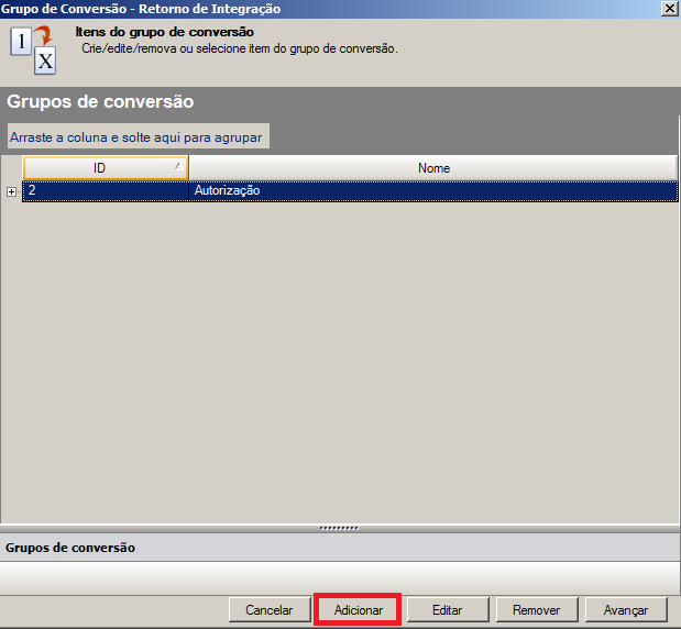 C.Será apresentada a tela itens do grupo de conversão, caso já exista uma tabela configurada pode ser editada, basta selecionar a tabela e clicar em Editar, neste caso clique em Adicionar para criar uma nova tabela de conversão de integração.