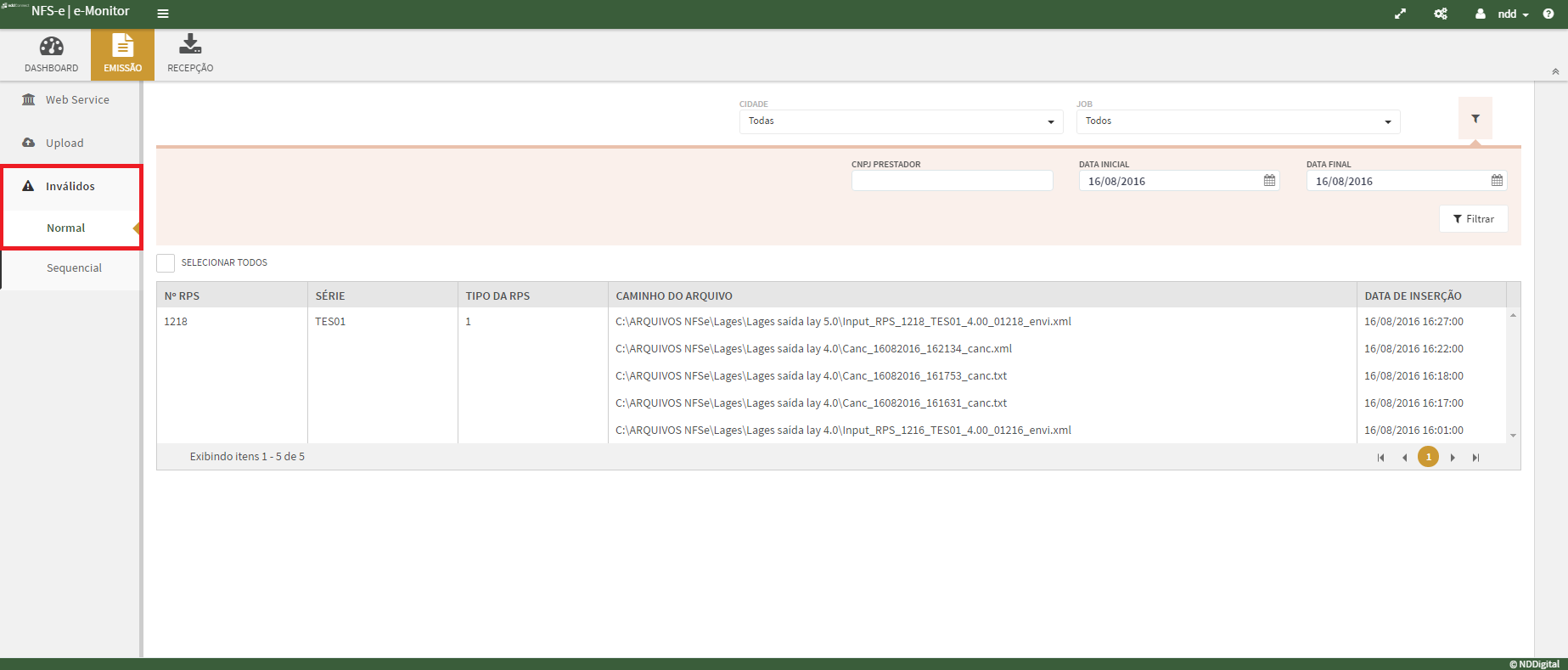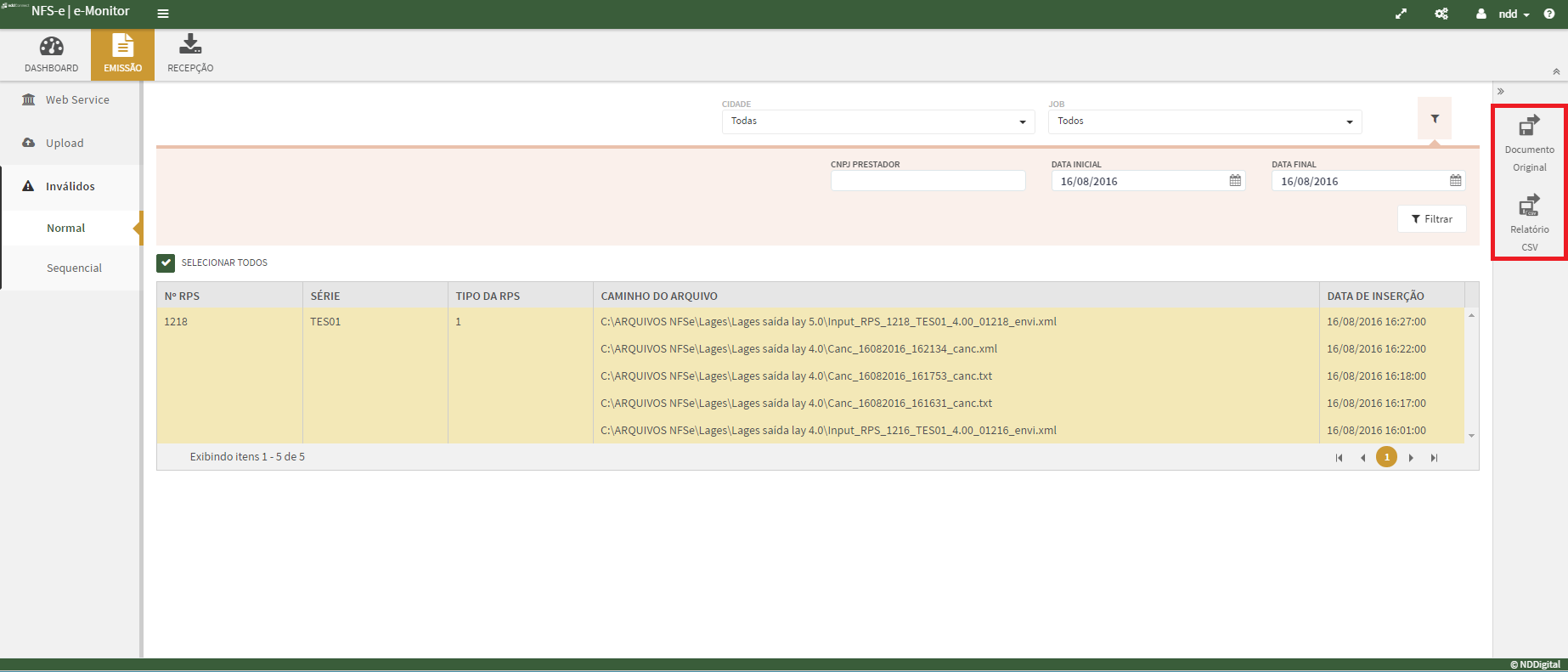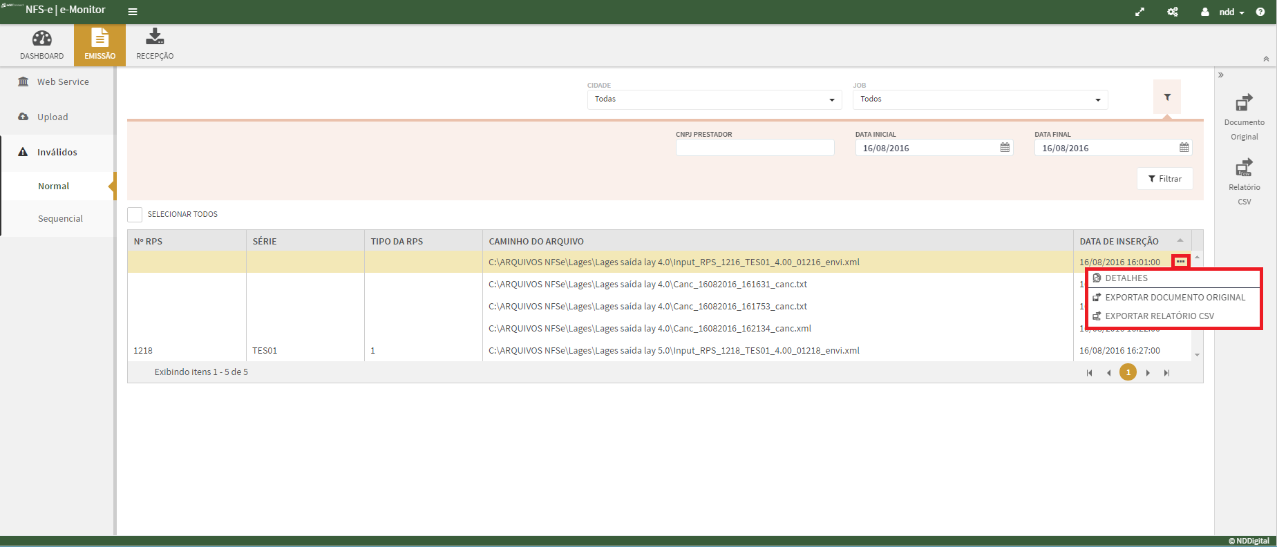 Neste menu será informado os documentos inválidos normal, será possível realizar a exportação do Documento Original, relatório CSV e visualizar detalhes do documento.