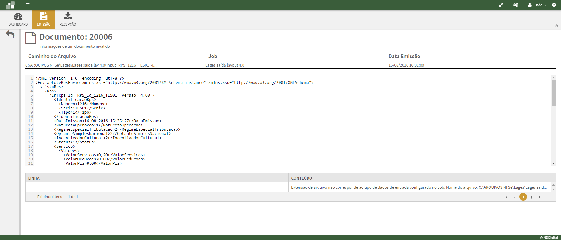 Na tela Detalhes é informado os dados do documento detalhadamente, entre seus dados estará sendo informado o documento original e o erro que foi gerado.