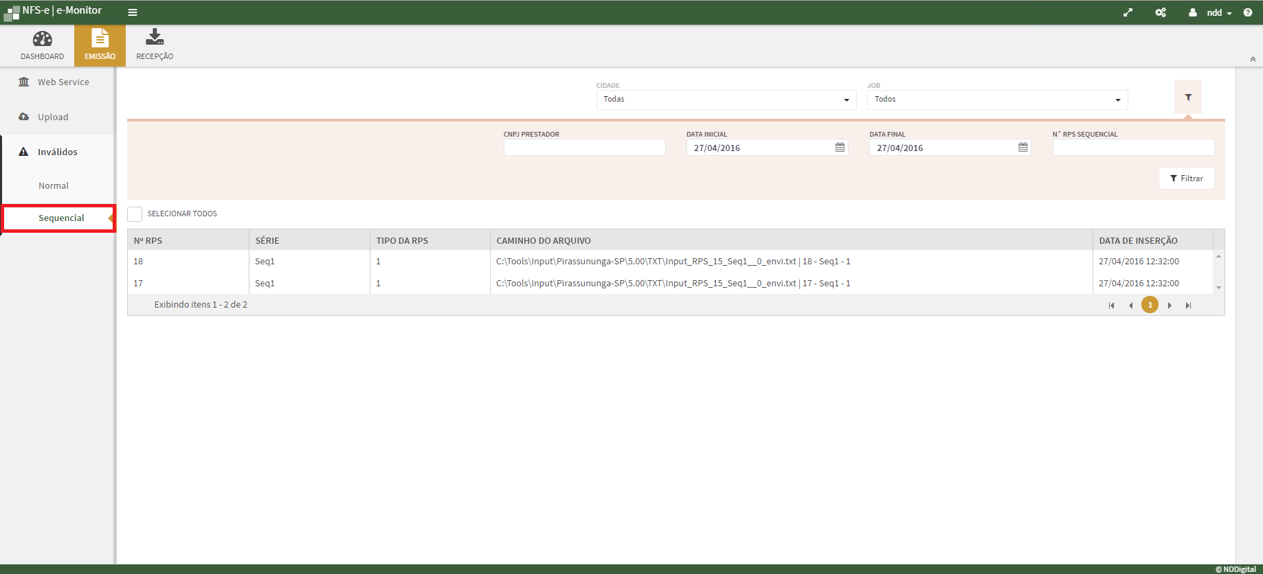 Documentos Inválidos Sequencial possui os seguintes filtros: |