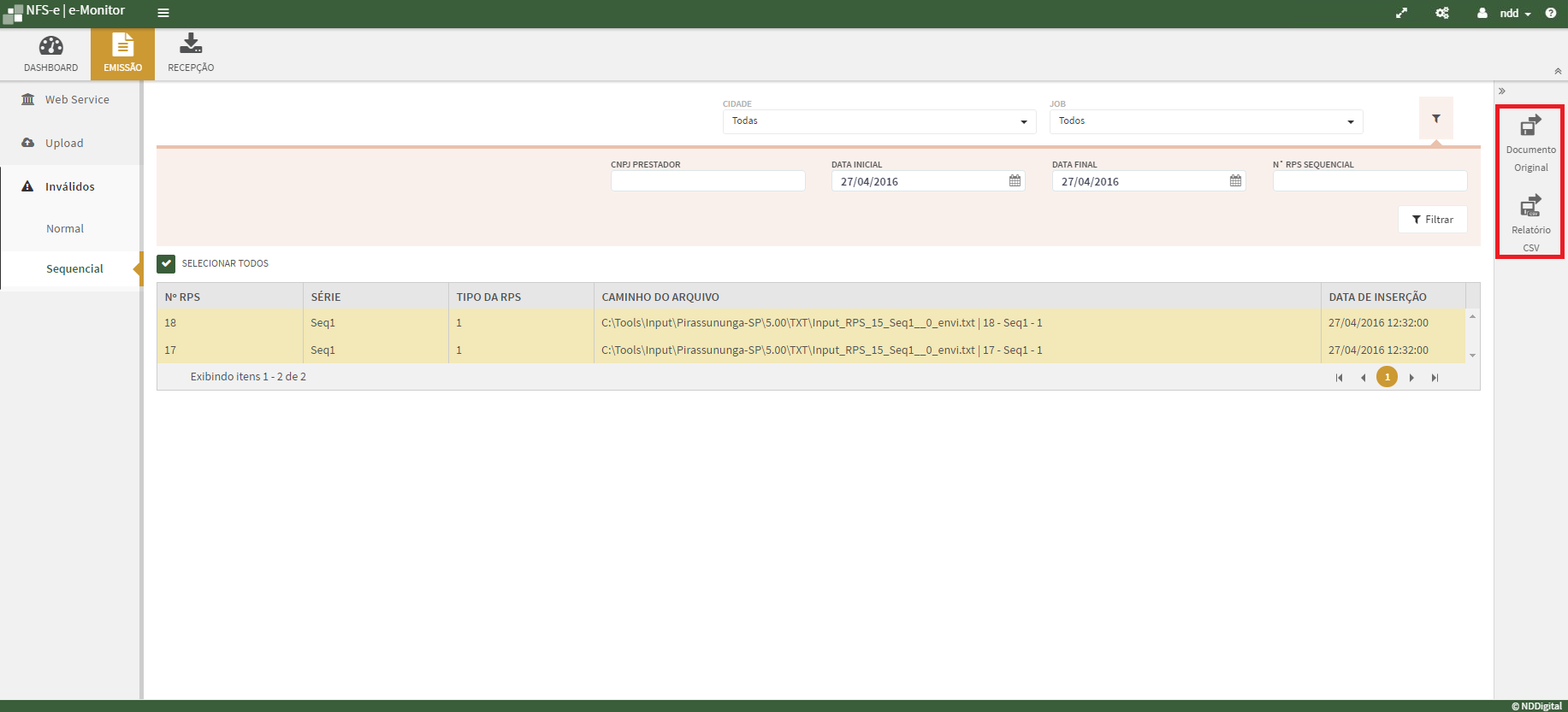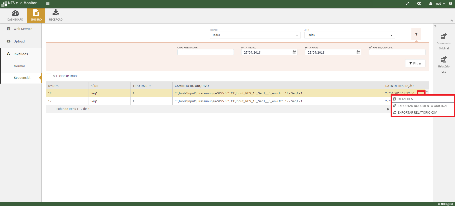 Neste menu será informado os documentos enviados pelo Job que está com a configuração de sequencial habilitada. Será possível visualizar os Detalhes do documento e realizar a exportação do Documento Original e Relatório CSV.