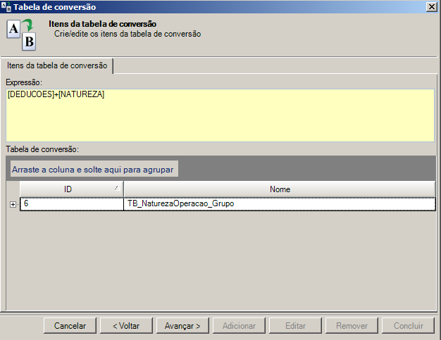 A.Deverá ser informado no campo Expressão quais expressões serão utilizadas para a concatenação. As expressões deverão ser informadas entre Colchetes “[]” e concatenadas com o operador “+”. Após preencher a expressão, selecione uma tabela de conversão para a expressão.