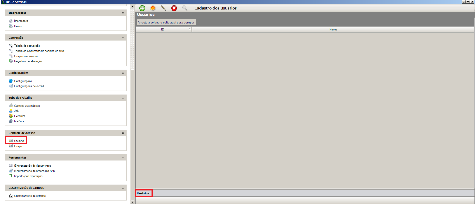 Passo 1: Clique na aba Controle de Acesso > Usuário, no menu à esquerda da interface do NFS-e Settings e em seguida na opção Usuários localizada na parte inferior da interface do NFS-e Settings. A figura abaixo ilustra a interface do NFS-e Settings com as opções destacadas.