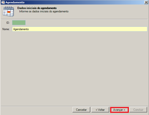 Passo 3: Na tela de Agendamento informe no campo Nome um nome para identificar o agendamento, em seguida clique no botão Avançar.