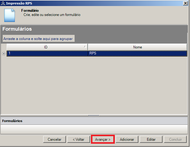 Passo 13: A tela Formulários será exibida, selecione o Formulário RPS cadastrado e clique no botão Avançar.