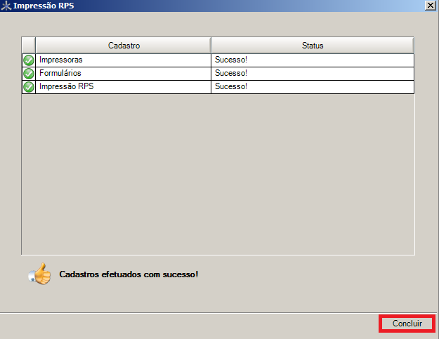 Passo 16: Será exibida tela com a mensagem "Cadastros efetuados com sucesso!", clique no botão Concluir para confirmar os dados informados.