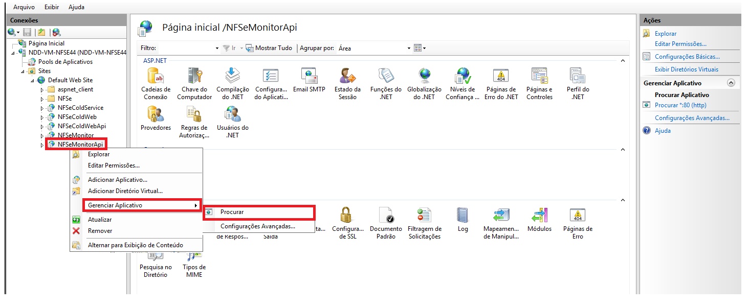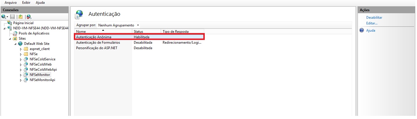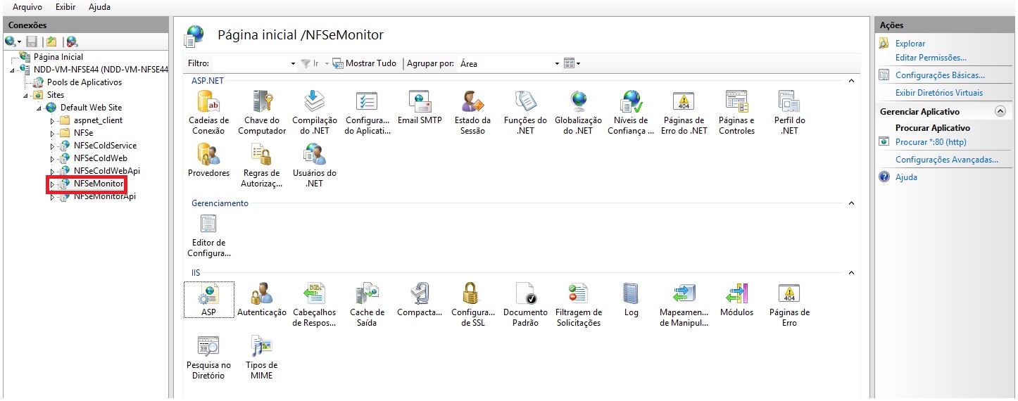 Passo 5: Acesse novamente o Internet Information Server (IIS) para dar permissão de autenticação ao site, clique sobre NFSeMonitor.