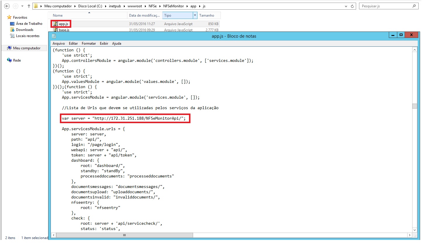 Passo 4: Para o correto funcionamento do portal é necessário apontar o endereço do site no arquivo "app.js" que é localizado no caminho C:\inetpub\wwwroot\NFSe\NFSeMonitor\app\js\app, caso o NFS-e Monitor esteja instalado em outro diretório deve ser localizada a instalação do portal. Após localizar o arquivo app.js altere o campo var server com o endereço "var server = http://localhost/NFSeMonitorAPI/". Para acessar de fora do servidor altere "localhost" para o "IP Servidor" onde está publicado o portal do NFSeMonitor.