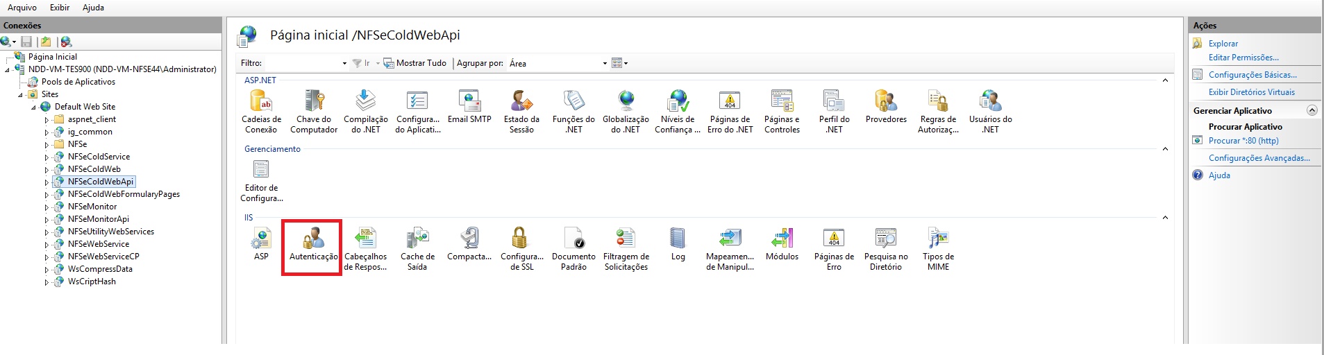 Passo 3: Acesse o Internet Information Server (IIS) para dar permissão de autenticação ao site, clique sobre NFSeColdWebAPI.