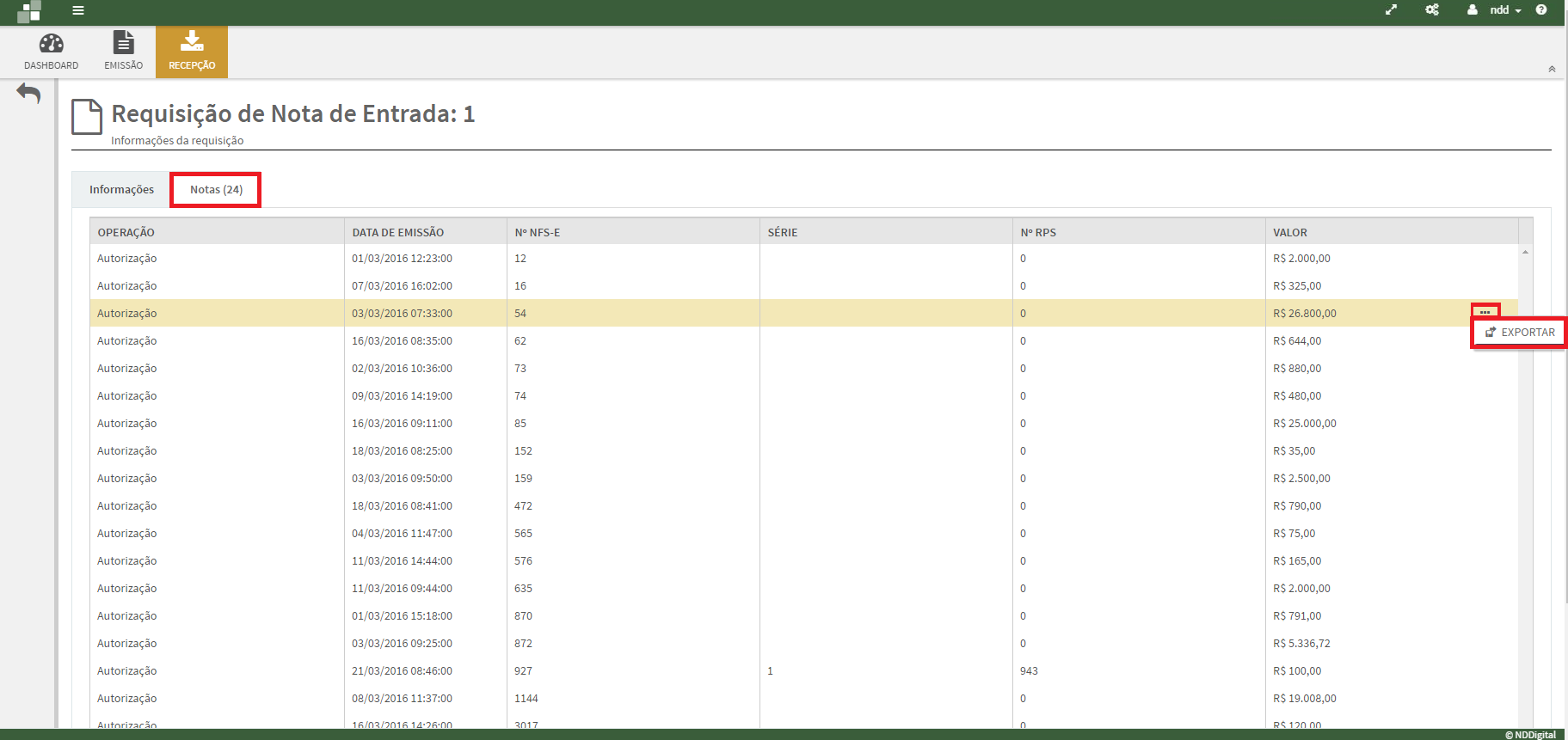 Passo 3: Na aba de Notas (), é possível fazer a exportação do documento, selecione o registro desejado e clique em reticências(...), localizado no final da linha na coluna "valor", em seguida clique em Exportar.