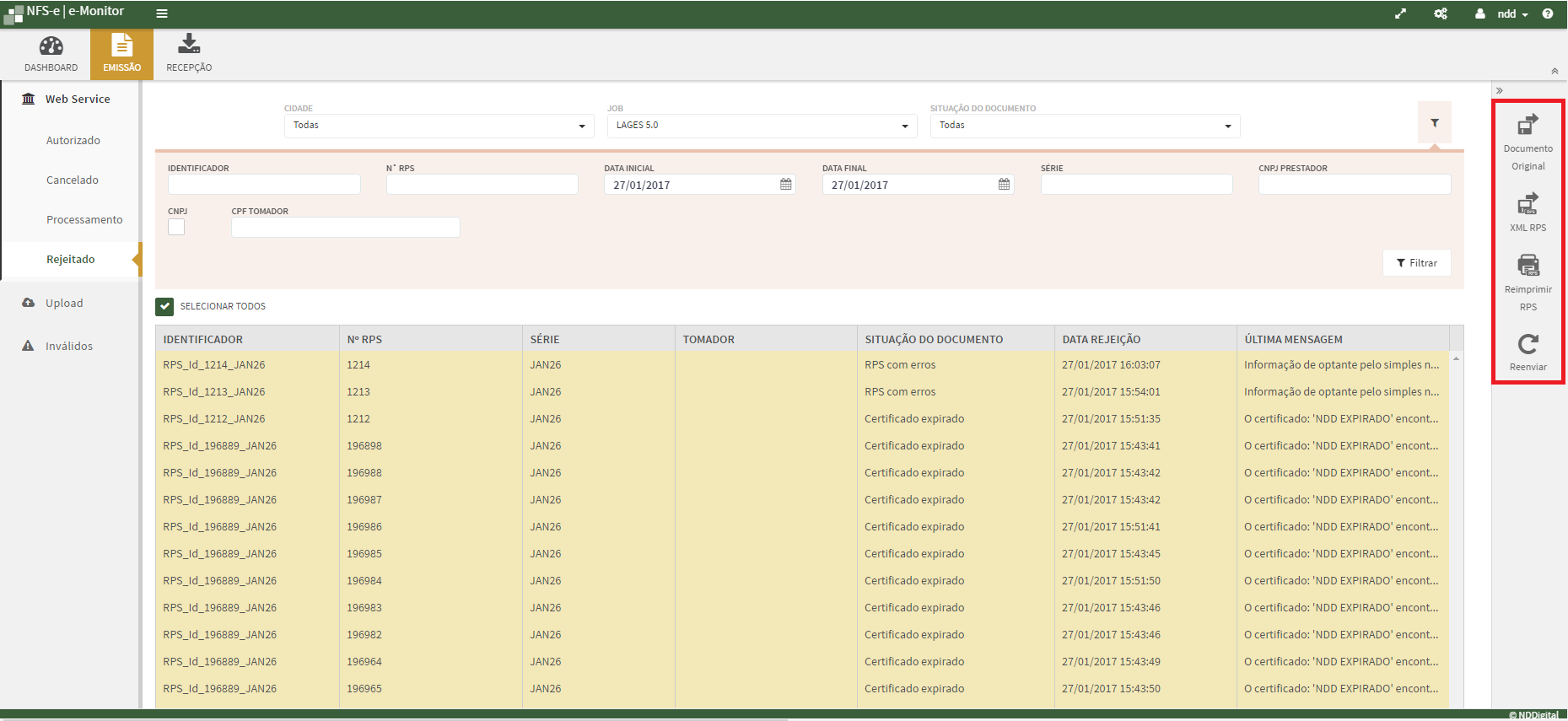 Na aba Rejeitados são exibidos todos os documentos que estão rejeitados. É possível também realizar as ações: Documento Original, XML de RPS, Reimprimir RPS e Reenviar.