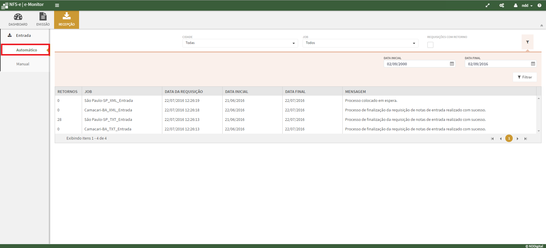 Na aba Automático é apresentados os processos de NFS-e de Entrada quando realiza a consulta no Web Service da prefeitura automaticamente conforme configurações realizadas no NFS-e Settings.