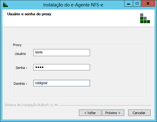 Passo 4: Na tela seguinte será solicitada a confirmação para utilizar comunicação com os WebServices da NDDigital através de servidores de Proxy. Esta opção só deverá ser utilizada se for necessária conexão com um servidor de Proxy para se comunicar com a internet. Caso seja necessário selecione a opção Usar Proxy, e clique em Próximo.