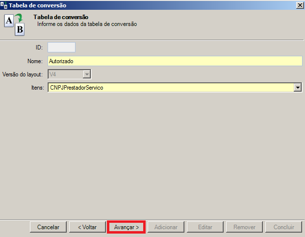 N.Na tela itens do grupo de conversão, selecione a tabela desejada e clique em Avançar para dar continuidade nas configurações da tabela.