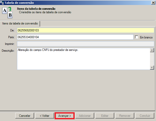 Q.Na tela grupo de conversão, selecione a tabela desejada e clique em Avançar para finalizar as configurações da tabela.