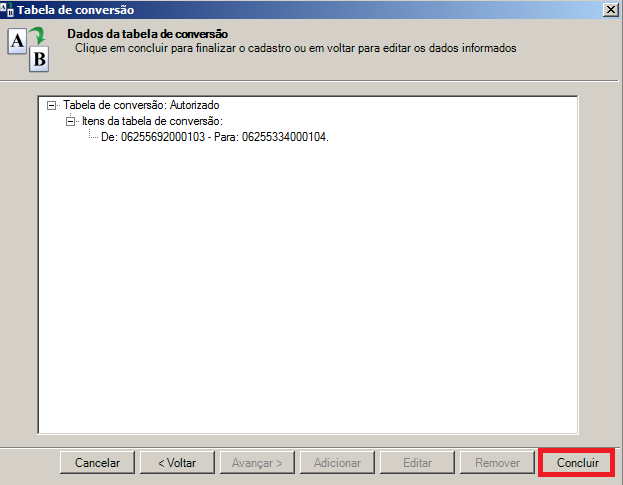 O.Na tela dados da tabela de conversão, será apresentados os dados das configurados, verifique as configurações realizadas e clique em Concluir.