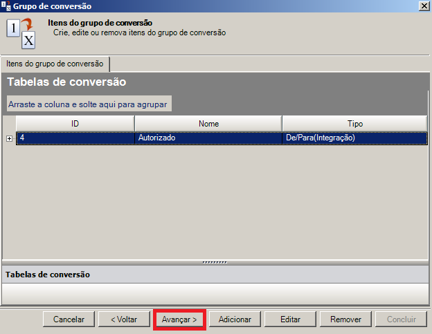 •Avançar: Selecione uma tabela e clique no botão Avançar para adicionar a tabela no Grupo de conversão.