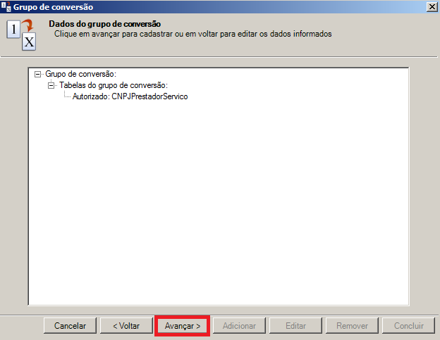G.Na tela tela assistente de grupo de conversão, clique em Avançar para dar continuidade na configuração da tabela de conversão de integração.