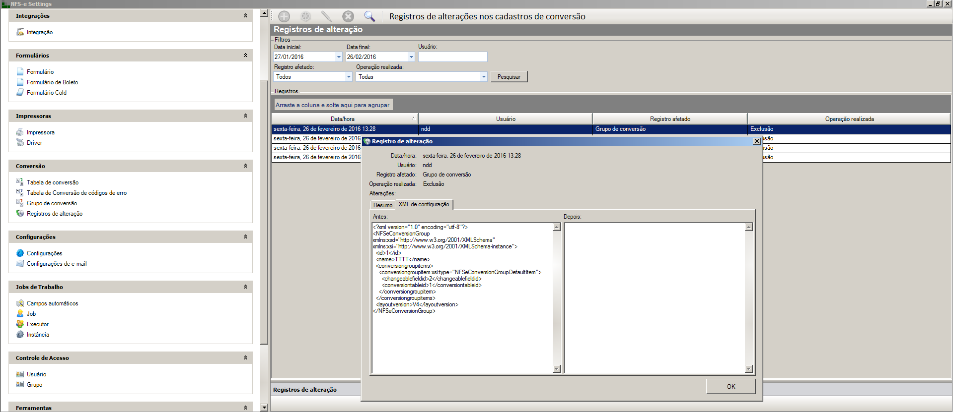 A.Alteração: Esta ocorrência é registrada quando são realizadas alterações em tabelas de conversão e Grupos de conversão.
