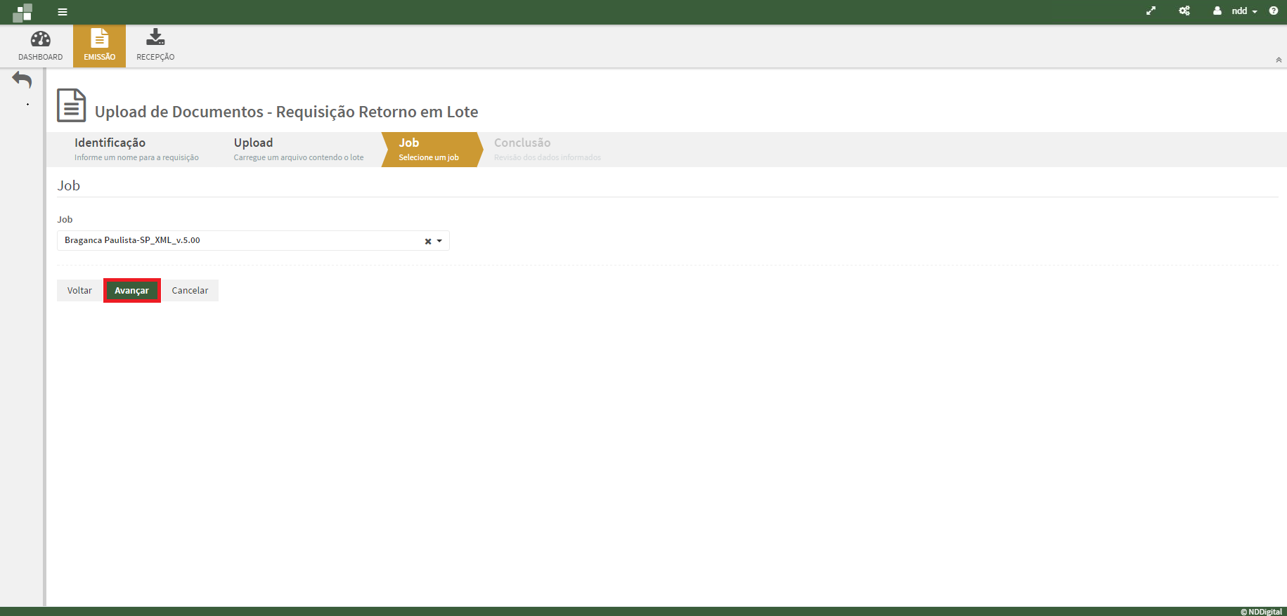 Passo 4: Na tela "Retorno em Lote aba RPS" Informe o Job de upload desejado, em seguida clique em Avançar.