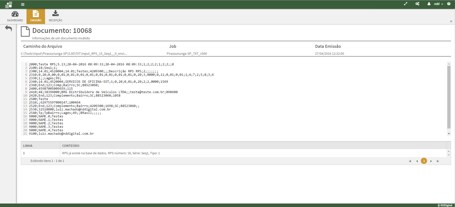 Na tela Detalhes é informado os dados do documento detalhadamente, entre seus dados estará sendo informado o documento original e o erro que foi gerado.