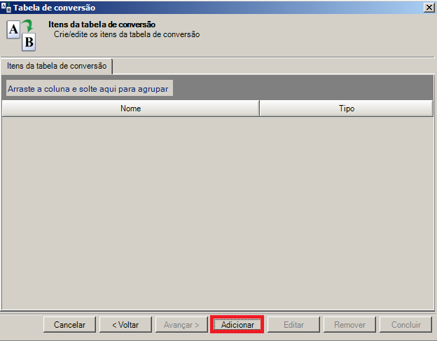 Passo 4: Na tela Itens da tabela de conversão, clique no botão Adicionar. No exemplo abaixo será criado um novo item para a tabela de conversão, para isso basta clicar no botão Adicionar, caso deseje editar um item da tabela de conversão já existente selecione a tabela e clique no botão Editar.