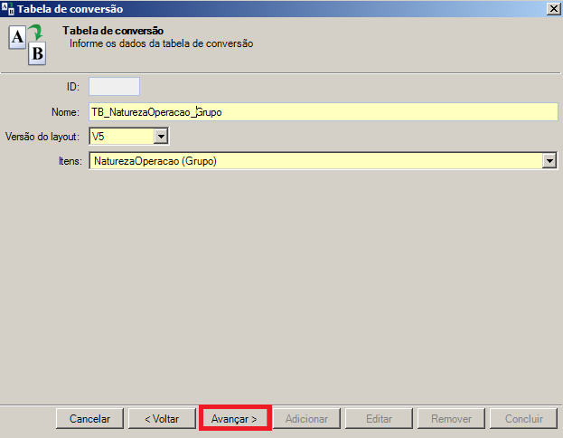 Passo 3: Na tela Tabela de conversão, realize as seguintes configurações: