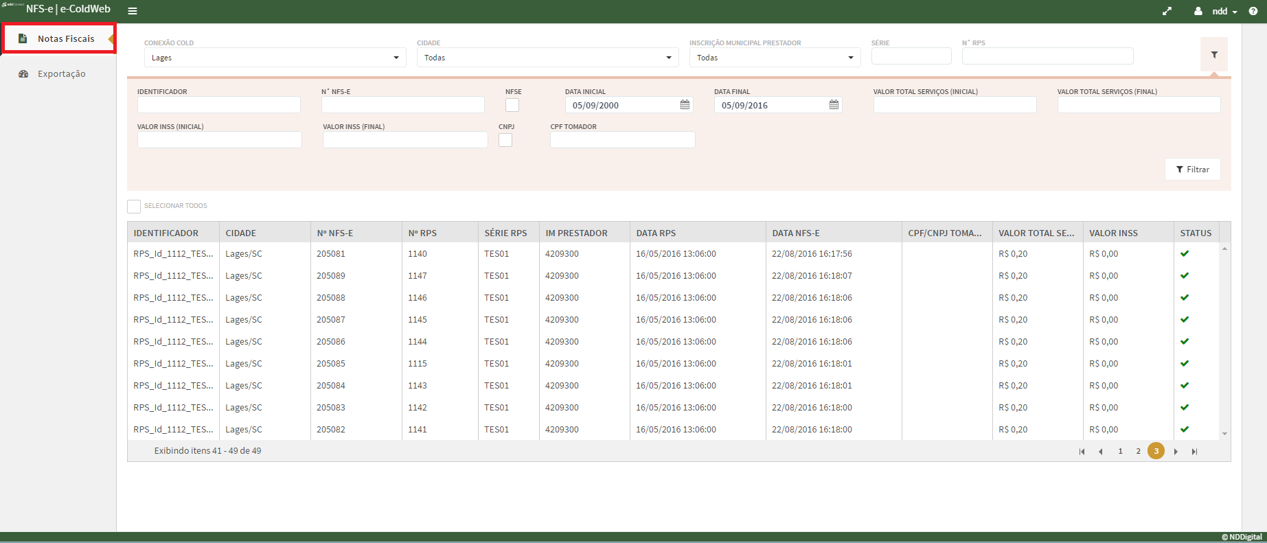 Na aba de Notas Fiscais é utilizada para visualização de documentos autorizados e cancelados inseridos no cold.