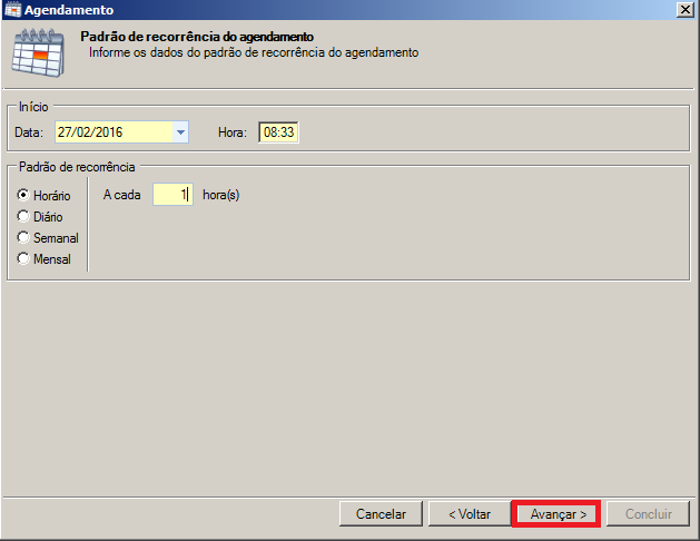 Passo 3: Na tela de Agendamento informe no campo Nome um nome para identificar o agendamento, em seguida clique no botão Avançar.