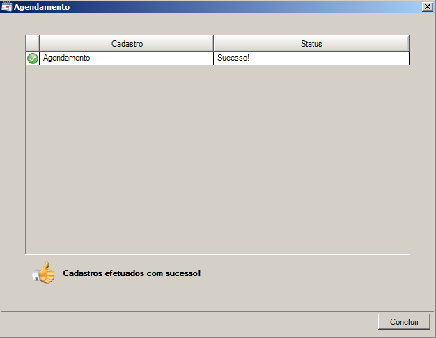 Passo 6: Será exibida tela com a mensagem "Cadastros efetuados com sucesso!", clique no botão Concluir para confirmar os dados informados.